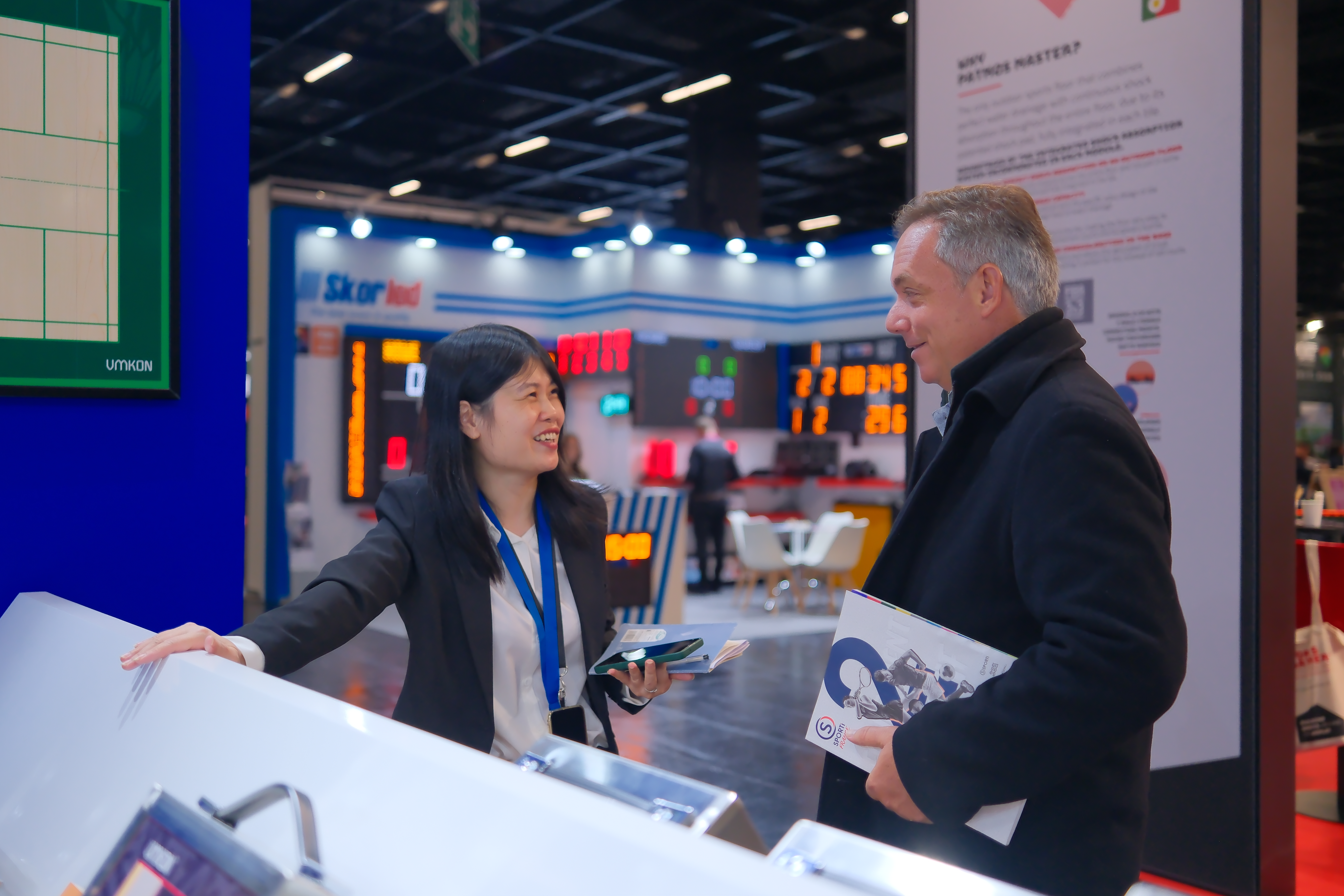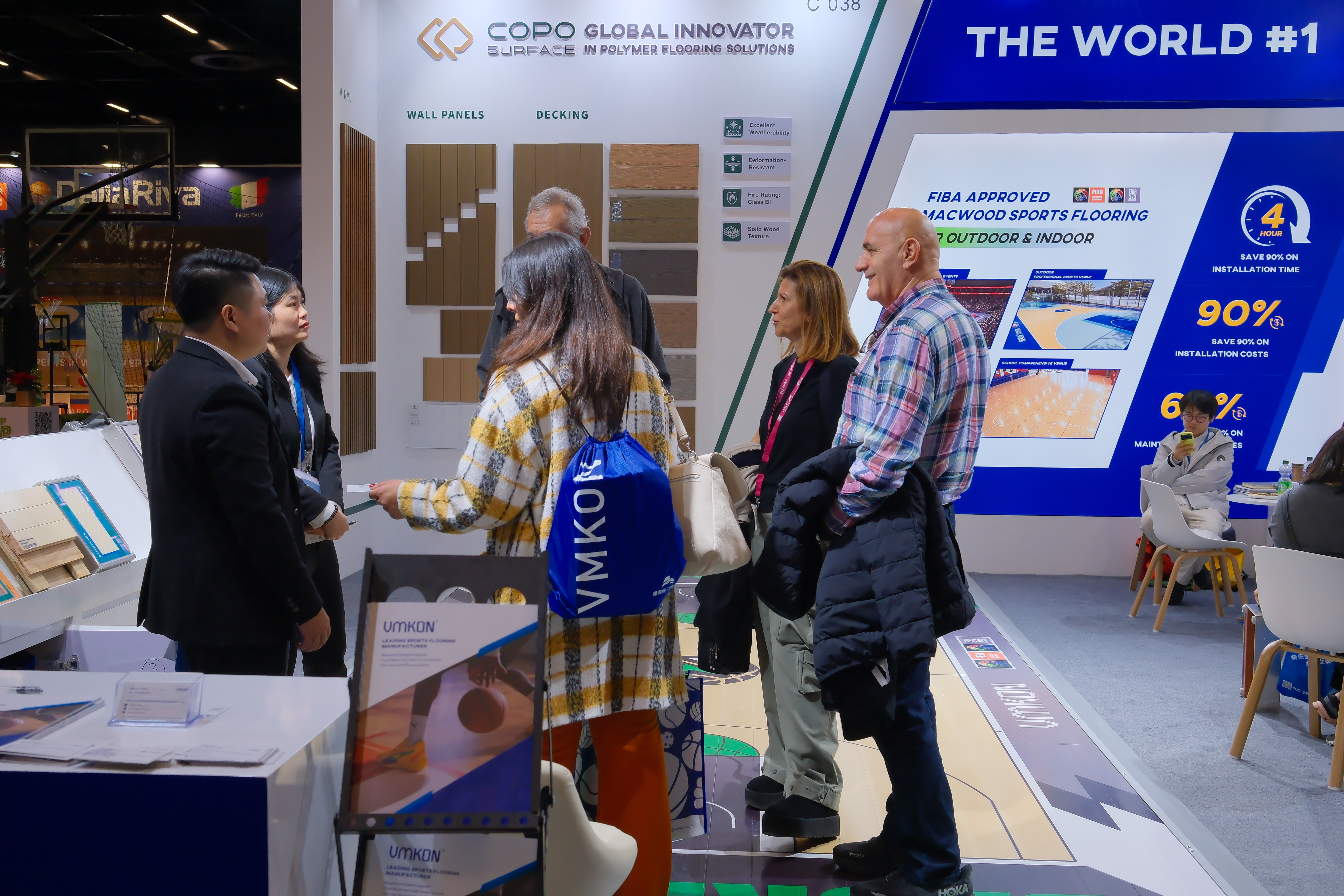 展會現(xiàn)場,唯美康通過“模擬戶外球場噴淋系統(tǒng)”的實景演示,讓觀眾直觀看到生物基地板在潮濕環(huán)境下的穩(wěn)定表現(xiàn),吸引大量專業(yè)觀眾駐足交流。來自歐洲多國的設計師、采購與技術人員就戶外適用性、維護便利性、材料可持續(xù)等議題進行了深入探討。